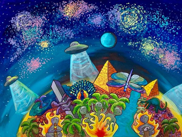 Rooted in a profoundly spiritual and fantastical view of life, the art celebrates the magic of the cosmos, the innocence of imagination, and the quiet wisdom of otherworldly beings. With vibrant colors and playful forms, these creations speak to the inner child and the eternal soul alike.